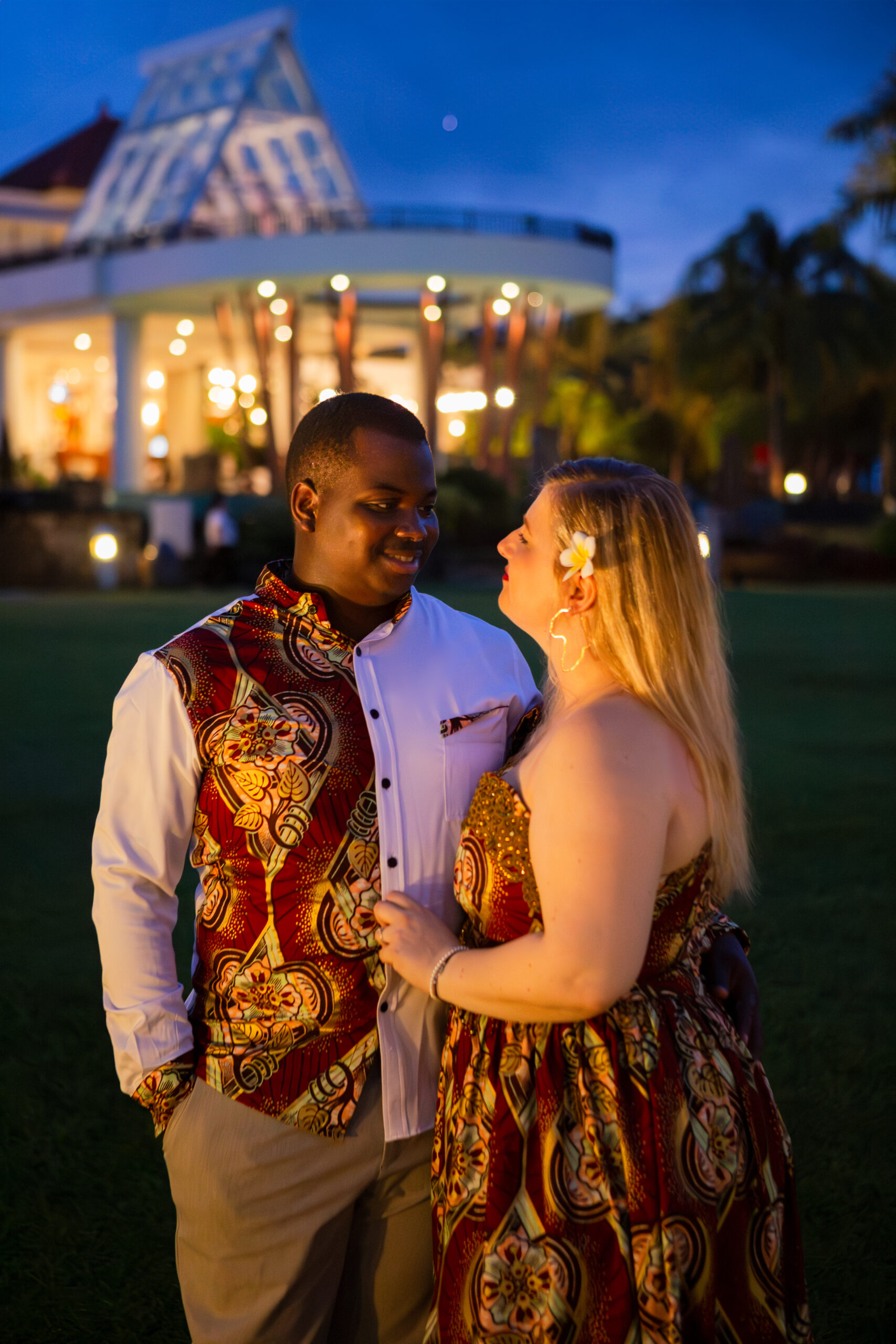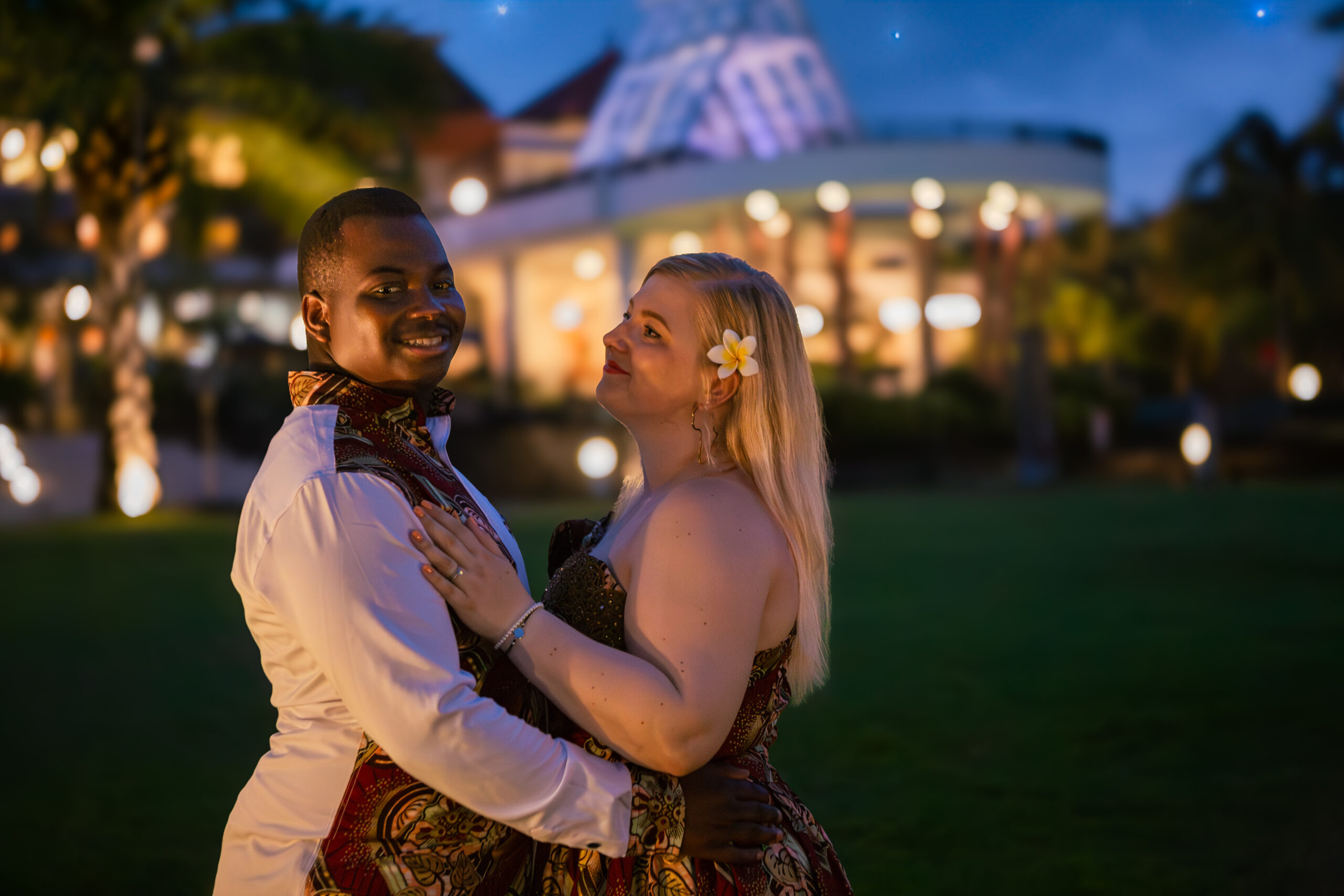 Later, in the golden warmth of their hotel garden, the scene shifted to something softer. Wrapped in string lights, laughter, and gentle touches, their complicity shone as brightly as the stars above.